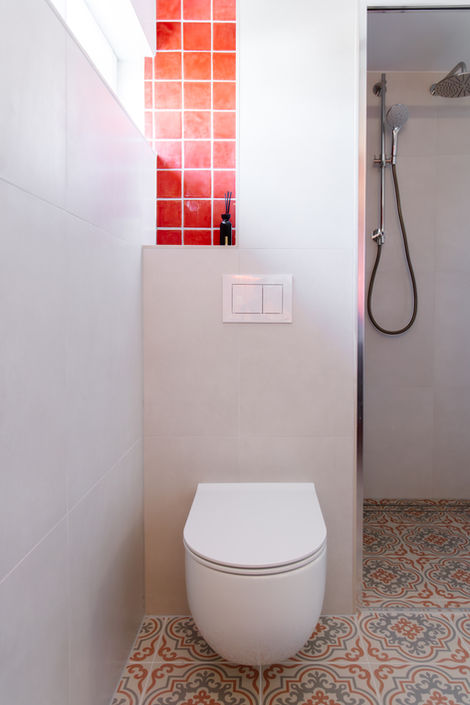 Niet alles liep in één keer perfect. Het toilet zat oorspronkelijk op een andere plek, maar paste niet goed in het ontwerp. De oplossing werd uiteindelijk een van de sterkste elementen van de ruimte. Het wandje waar het toilet aan hangt kon door het raam niet volledig worden doorgetrokken, dus werd er een nis gecreëerd. Bekleed met dezelfde oranje tegel, waardoor het niet als een compromis voelt, maar juist als een bewust ontwerpdetail. Ook de keuze voor een glazen schuifdeur in de douche komt voort uit diezelfde gedachte. Zo blijft de ruimte open en licht, en voelt de badkamer groter dan hij daadwerkelijk is.