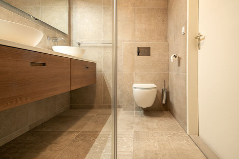 Het toilet in de aparte ruimte is, evenals het fonteintje, matwit. De opzetkom staat op een massief houten schap. De muren zijn niet tot in de volledige hoogte betegeld, om een benauwend gevoel te voorkomen.